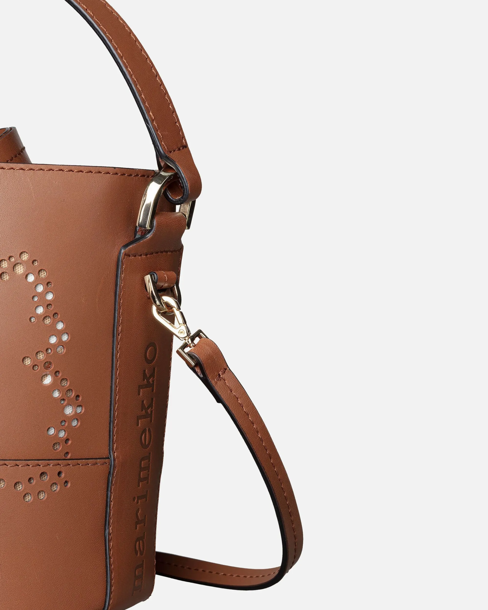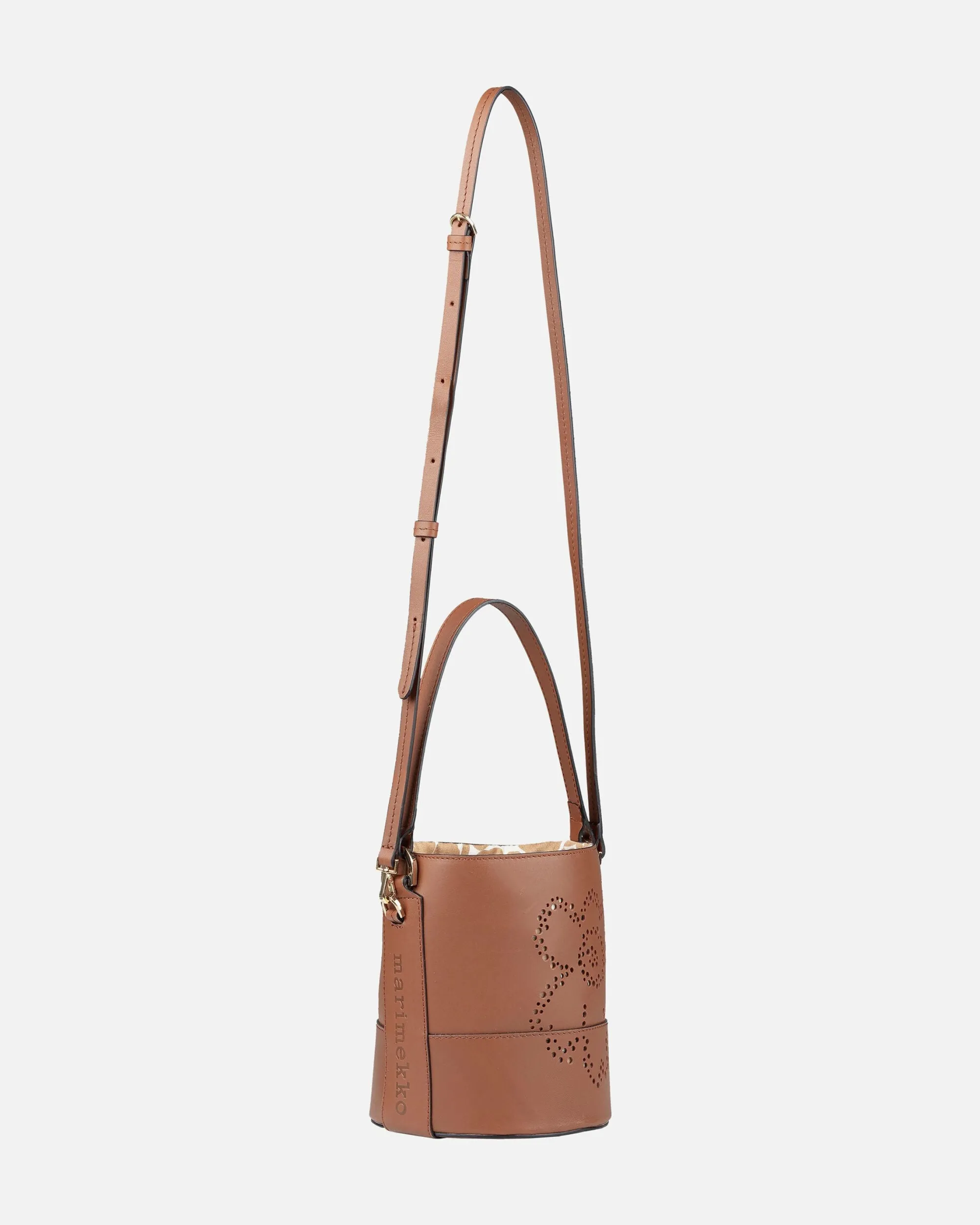 Imprint Small Bucket Unikko -Laukku On Valmistettu Jäljitettävästä Skandinaavisesta Nahasta. Etupuolen Unikko-Kukka Muodostuu Pitsimäisesti Pienistä Rei’Istä. Laukussa On Kantohihna Sekä Irrotettava Ja Säädettävä Olkahihna. Laukun Suuaukko Vedetään Kiinni Nahkahihnojen Avulla Ja Kiinnitetään Stopparilla. Laukussa On Yksi Sisätasku. Sisävuori On Valmistettu Unikko-Kuosisesta Puuvillasta. Marimekko-Logo On Kohokuvioitu Laukun Sivuihin Ja Pohjaan.