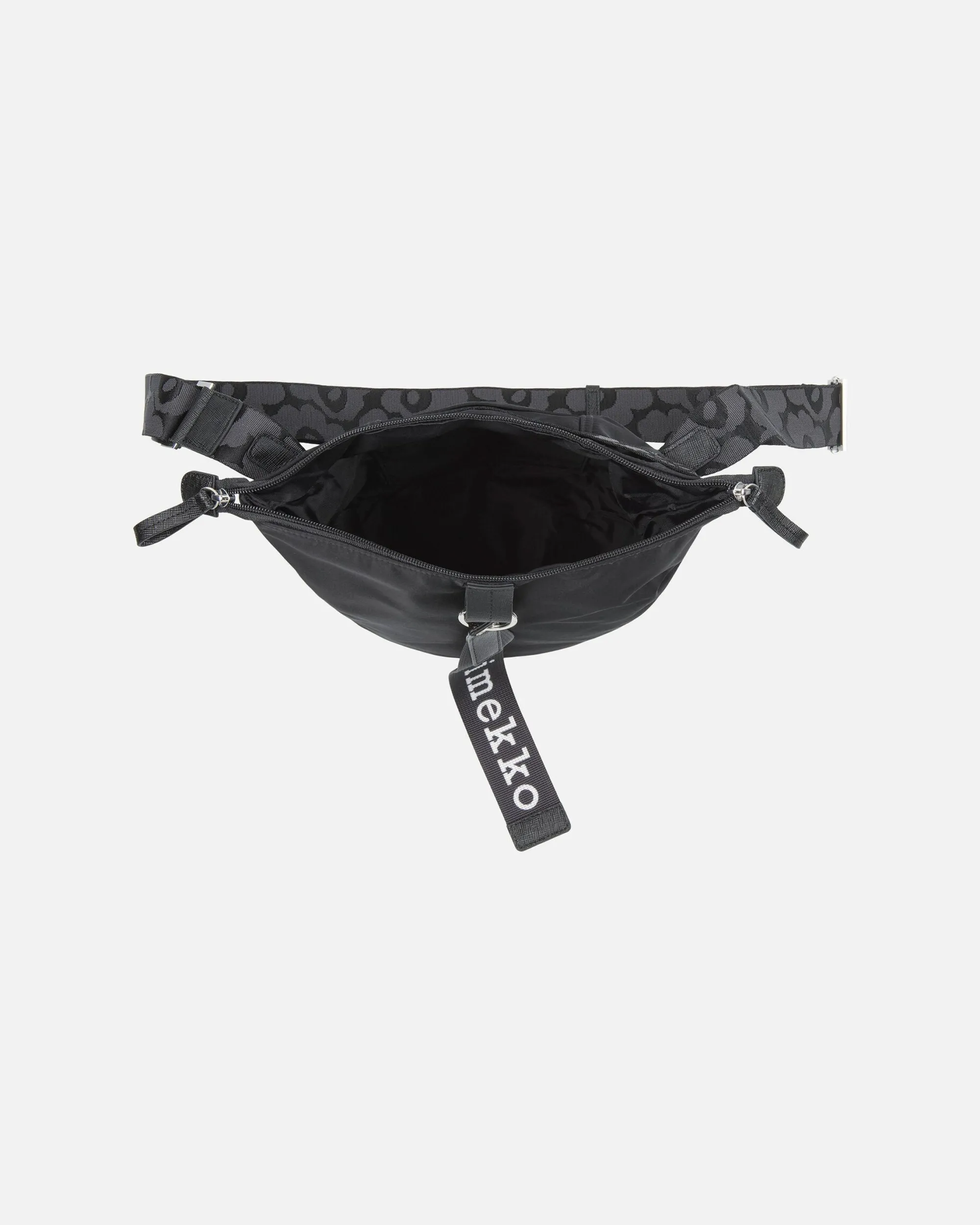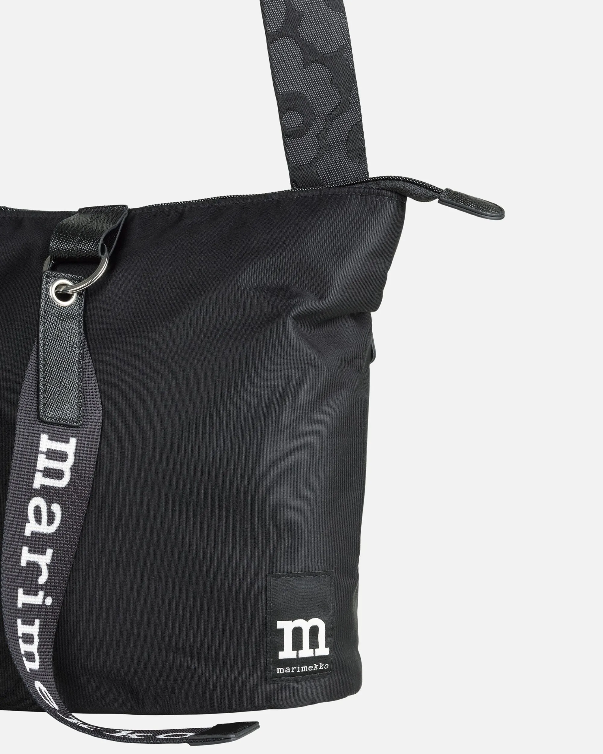 Carry All -Olkalaukku Sulkeutuu Vetoketjulla Ja Siinä On Kantokahva Sekä Säädettävä Olkahihna, Jossa On Jacquard-Kudottu Unikko-Kuosi. Laukussa On Yksi Sisätasku Sekä Yksi Avoin Ulkotasku. Etupuolelle On Kiinnitetty Marimekko-Avaimenperä.