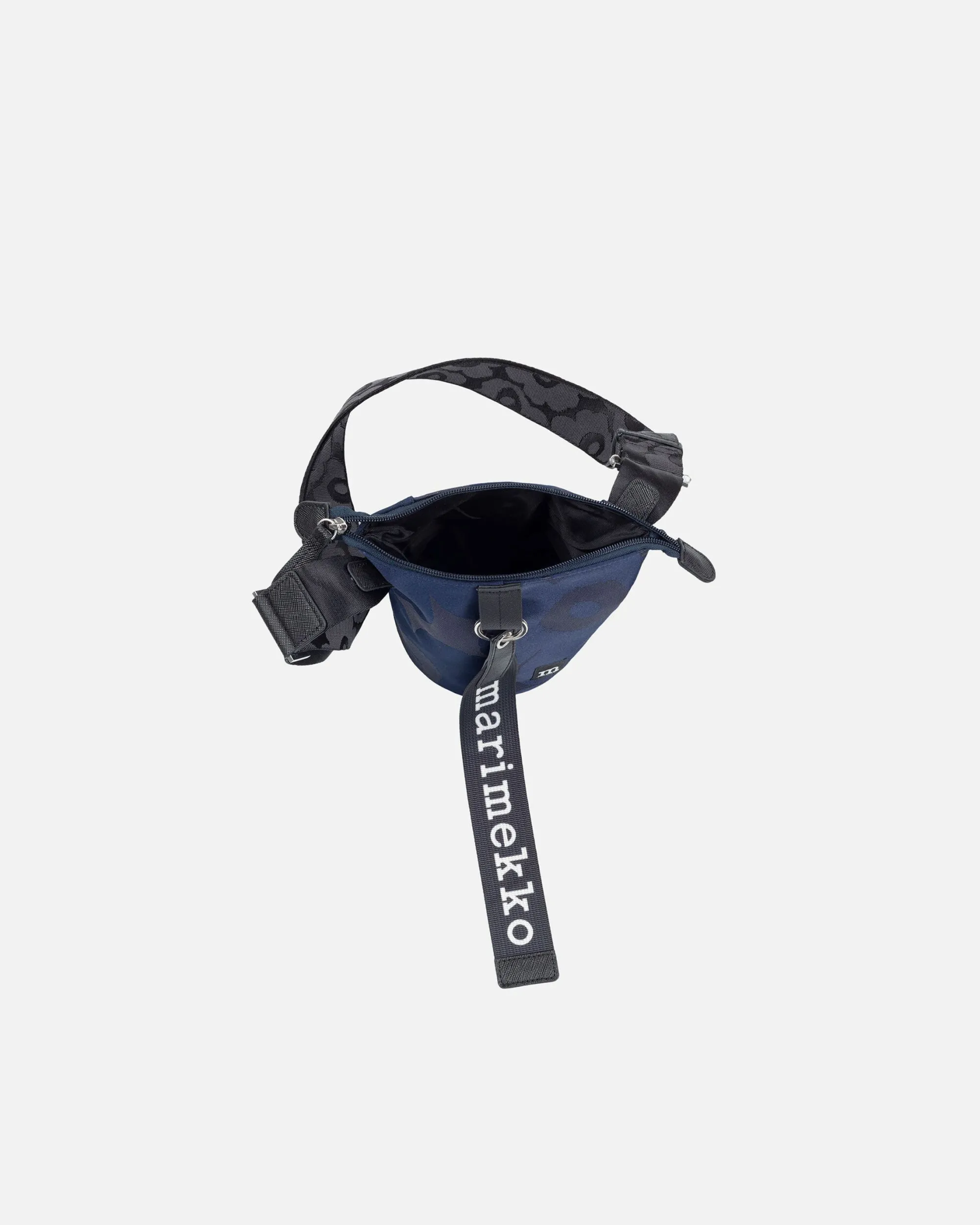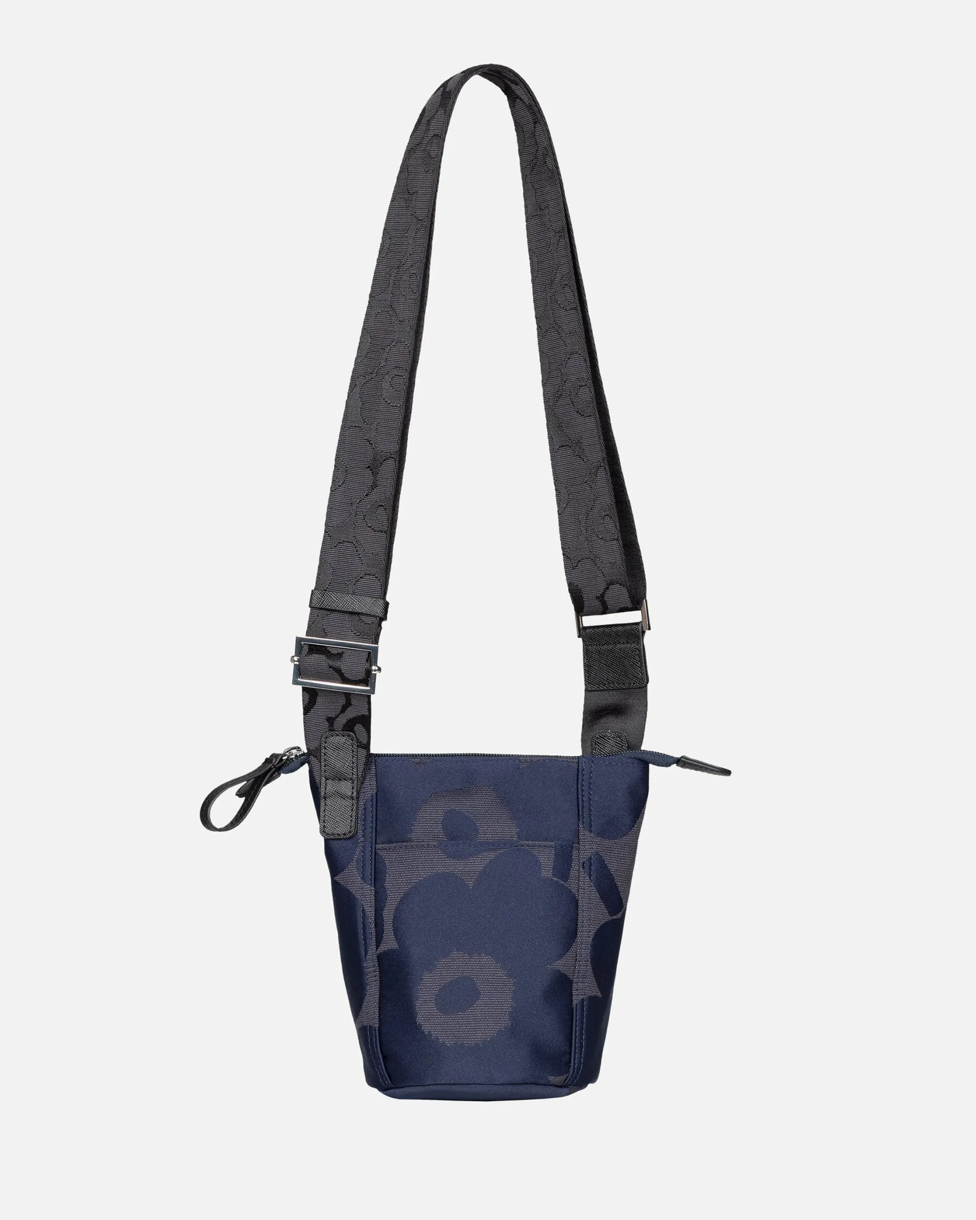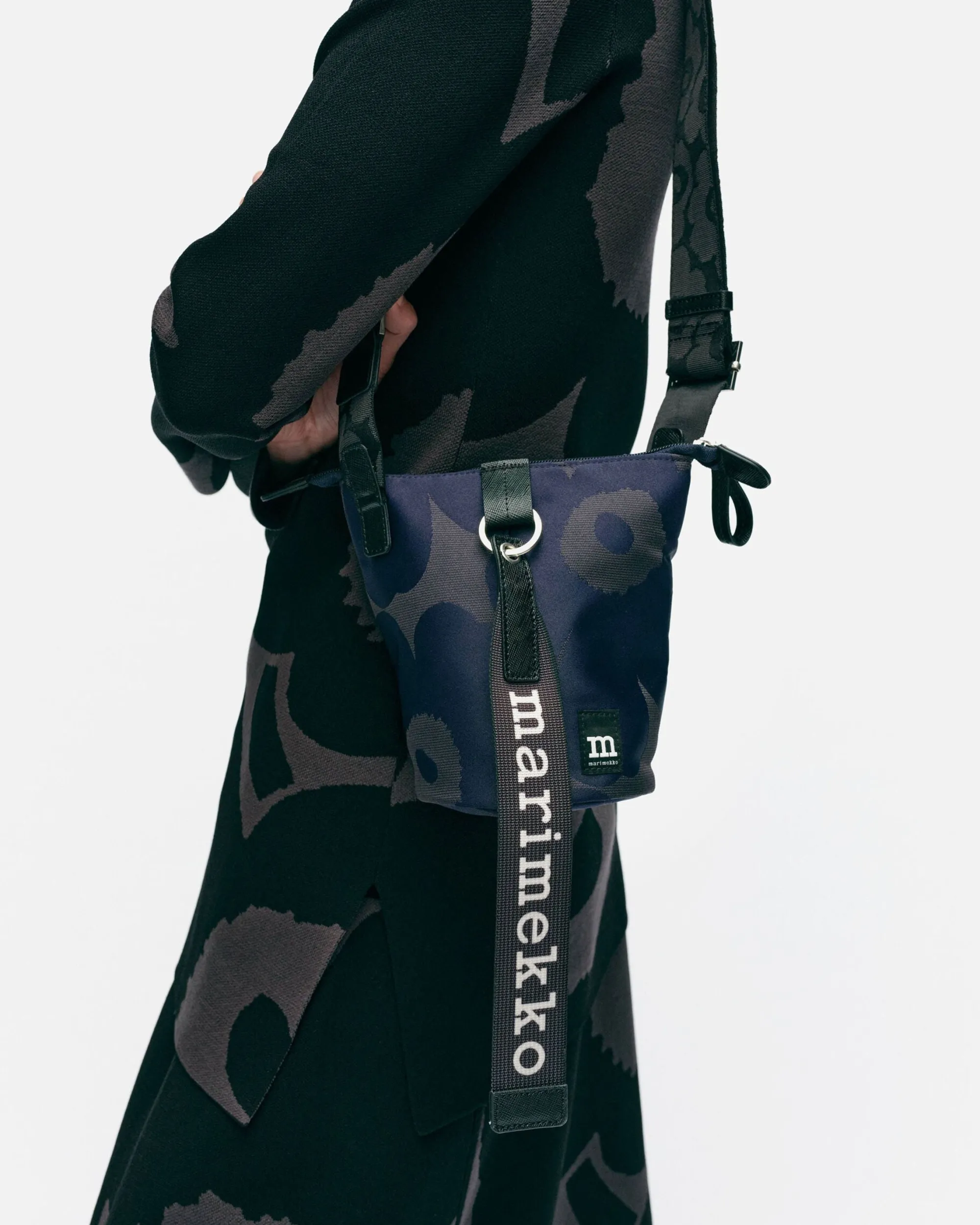 Essential Bucket -Olkalaukku On Valmistettu Kierrätetystä Polyesteristä, Jossa On Jacquard-Kudottu Unikko-Kuosi. Pienessä Laukussa On Vetoketjukiinnitys Ja Säädettävä Olkahihna. Etupuolelle On Kiinnitetty Marimekko-Avaimenperä Ja Takapuolella On Yksi Avoin Tasku. Laukussa On Nahkaisia Yksityiskohtia.