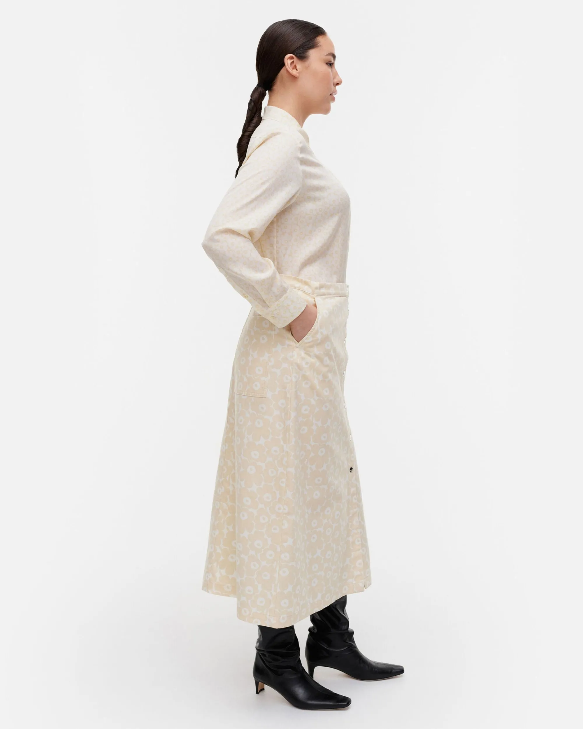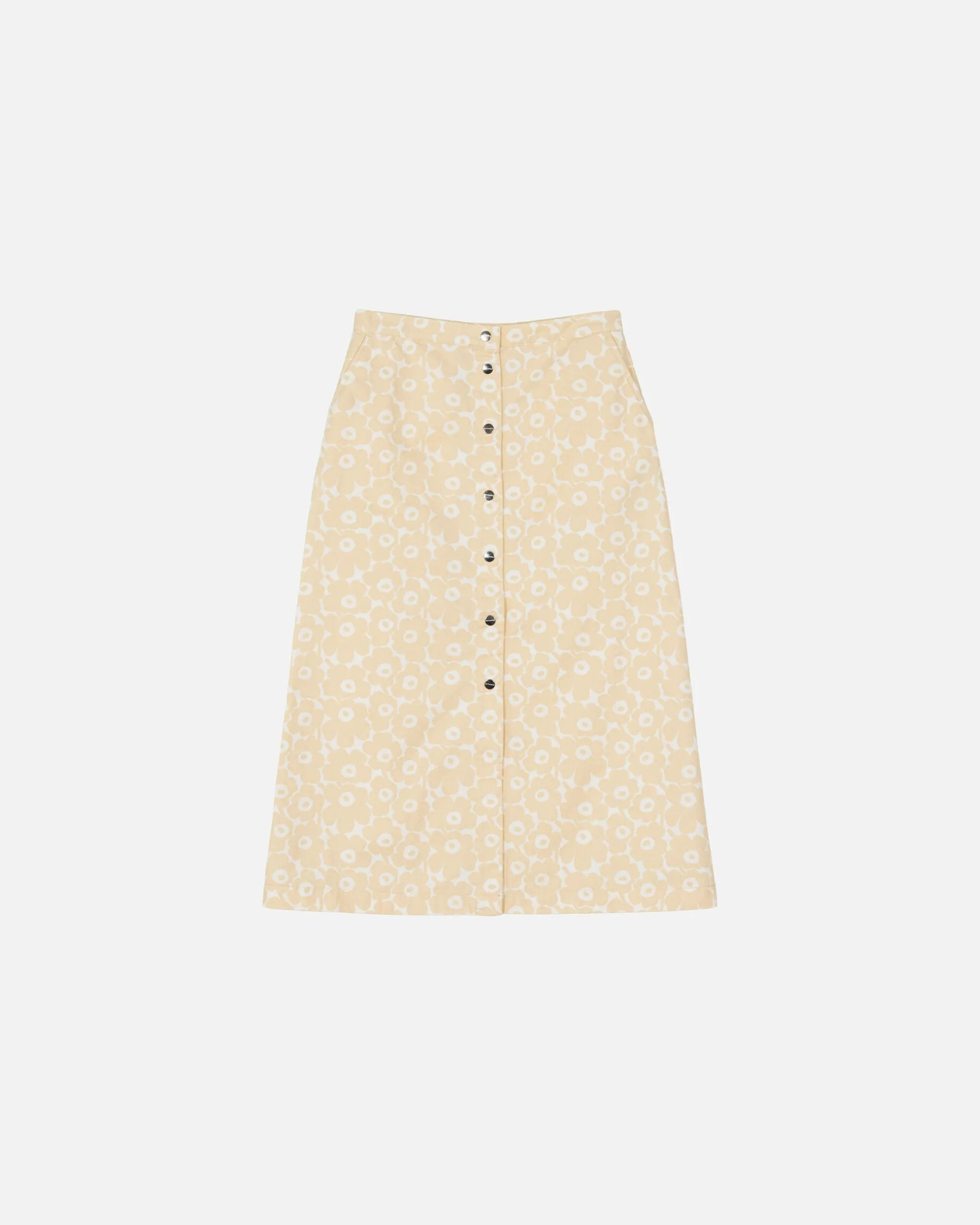 Puoli-Hame On Valmistettu Luomupuuvillatvillistä Ja Siinä On Niukka Istuvuus, Suora Leikkaus Sekä Unikko-Kuosi. Hameessa On Vyötärökaitale, Jossa On Takana Leveä Vyölenkki, Painonappisuljenta Edessä Ja Viistot Sivutaskut. Takana On Isot Paikkataskut.