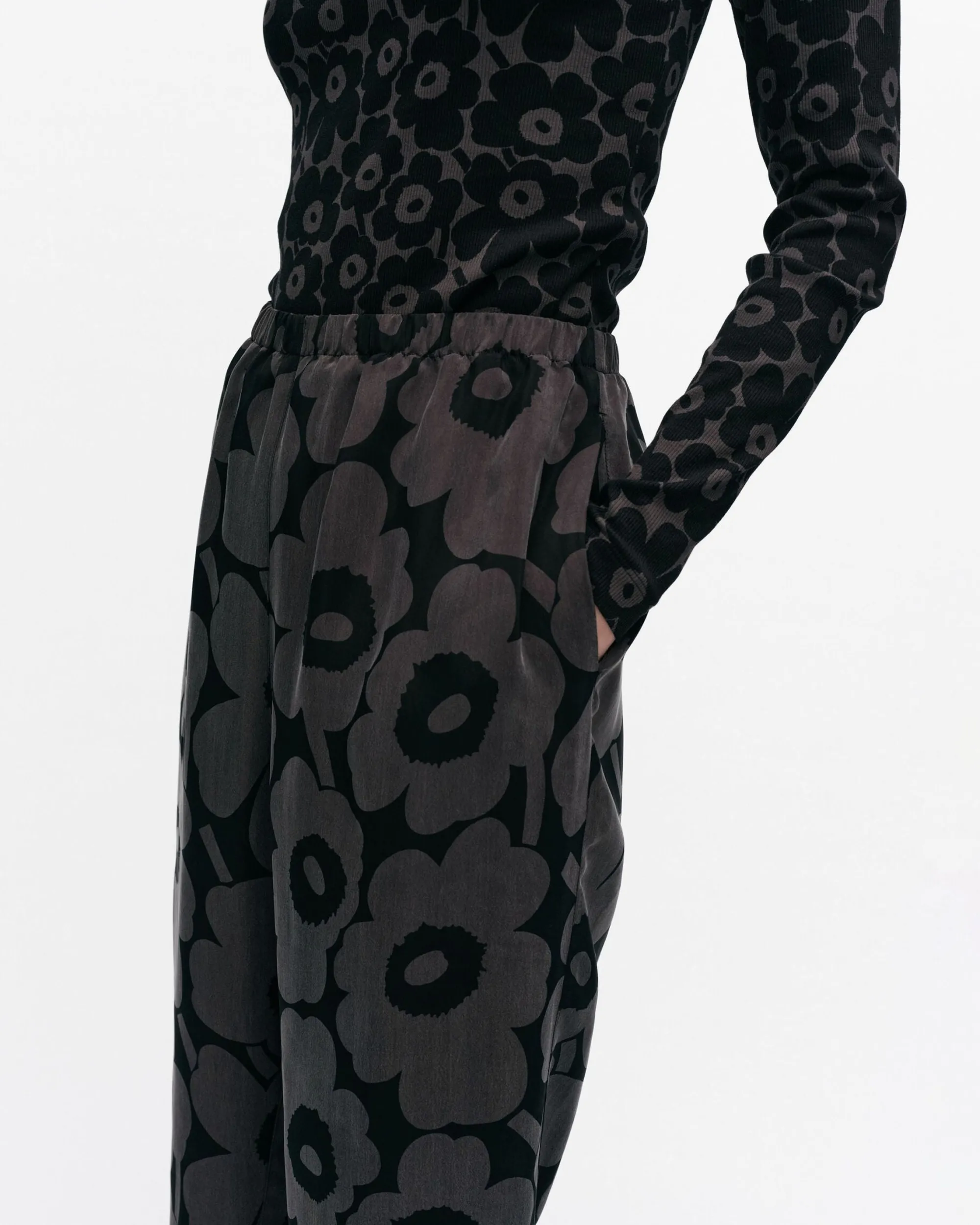 Moreski-Kuprohousuissa On Rento Istuvuus, Suora Leikkaus Ja Unikko-Kuosi. Housuissa On Kapea Kuminauhavyötärö Ja Sivusaumataskut.