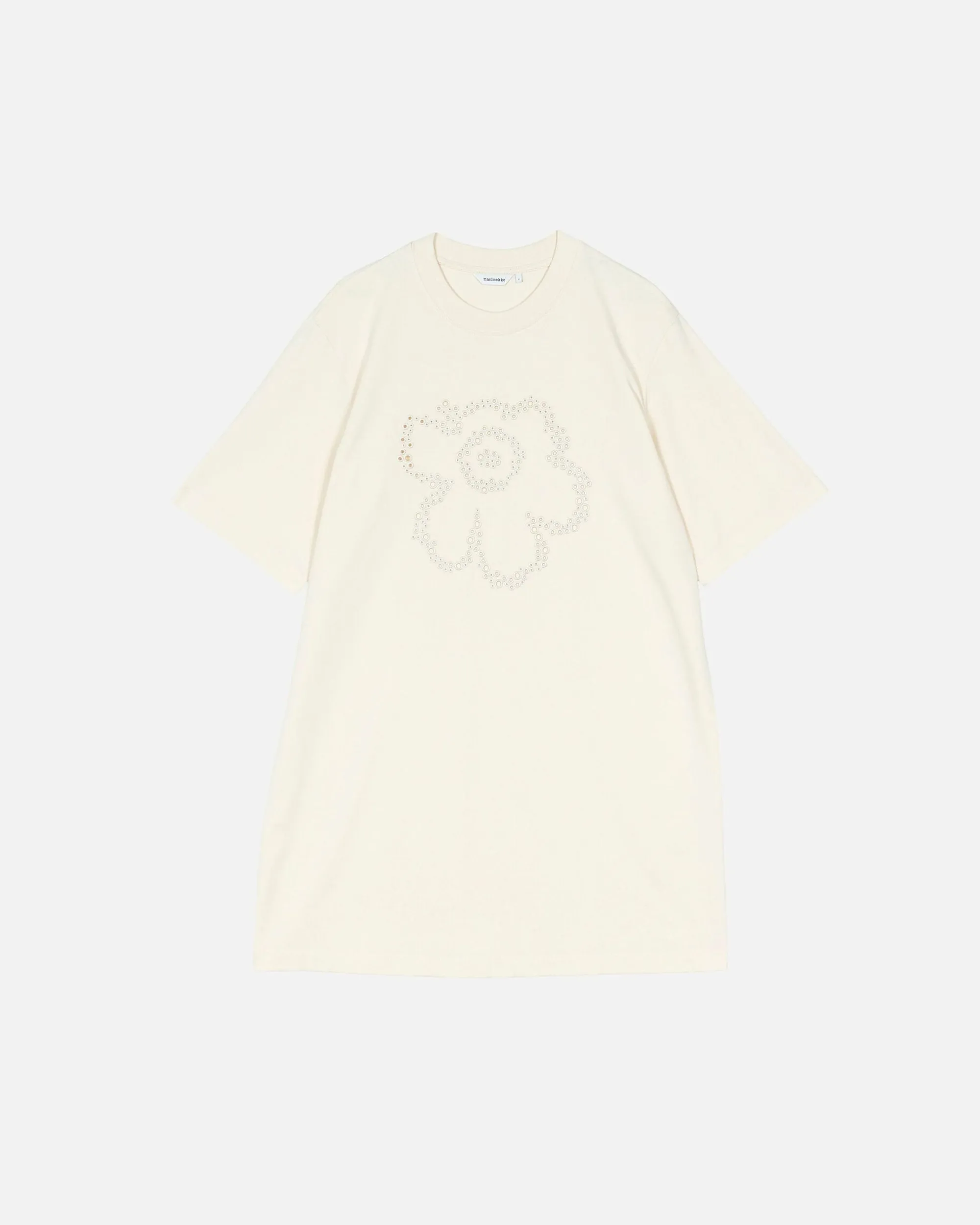 Säteet-T-Paitamekko On Valmistettu Luomupuuvillatrikoosta Ja Siinä On Väljä Istuvuus, Suora Leikkaus Sekä Pitsimäisesti Brodeerattu Unikko-Kukka Etupuolella. Mekossa On Leveä Resori Pyöreässä Pääntiessä Ja Väljät, Kyynärmittaiset Hihat.