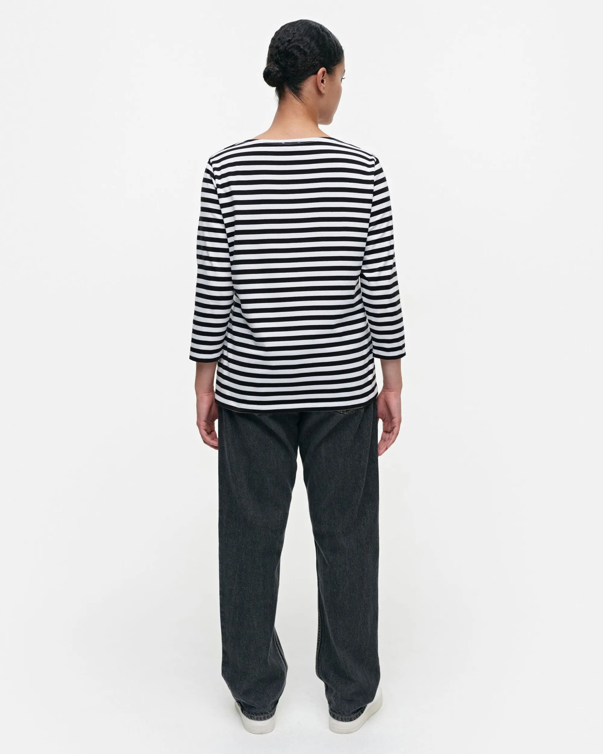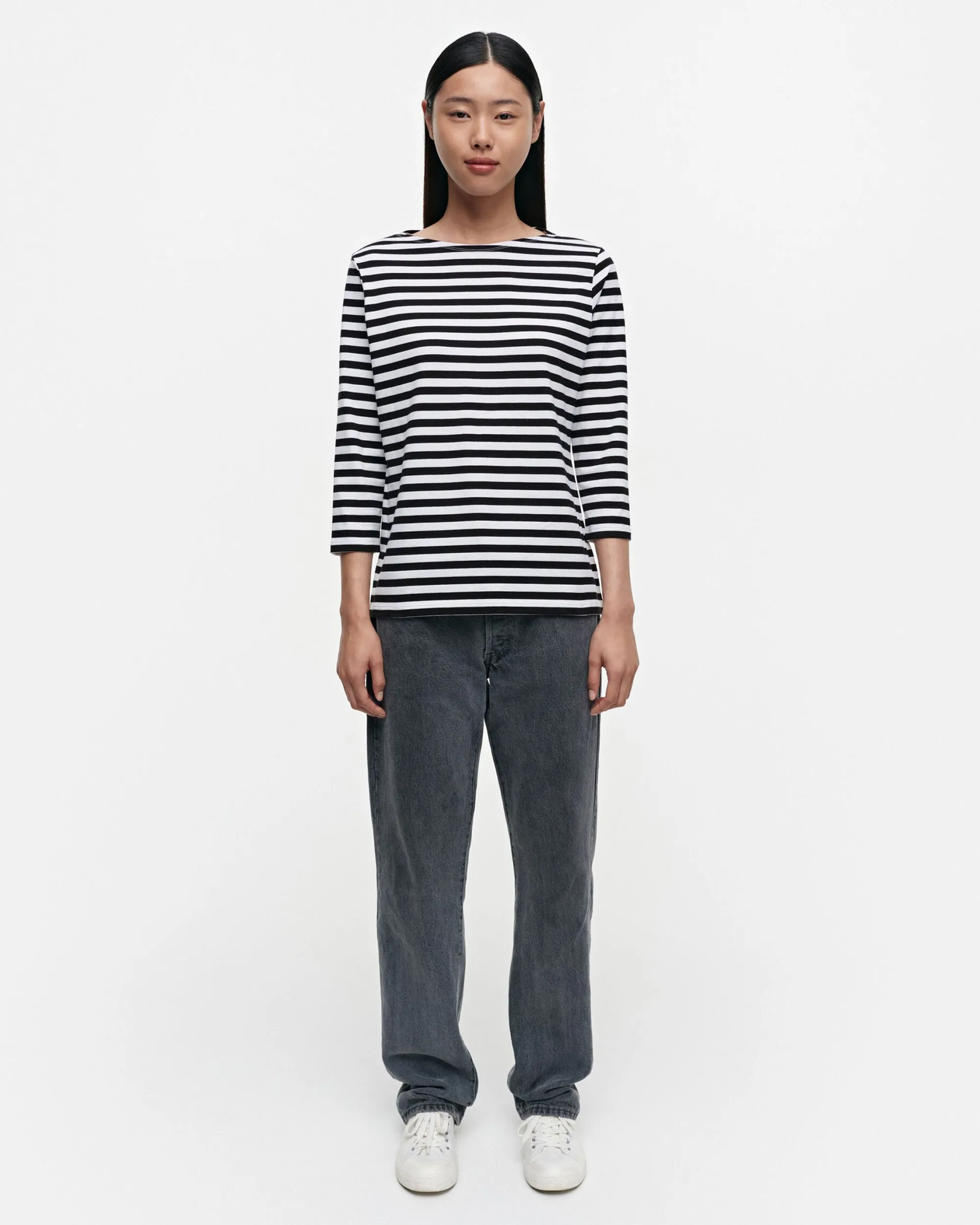Puuvillatrikoosta Valmistetussa Ilma-Paidassa On Klassinen Tasaraita-Kuosi, Venepääntie Sekä Vajaamittaiset Hihat.