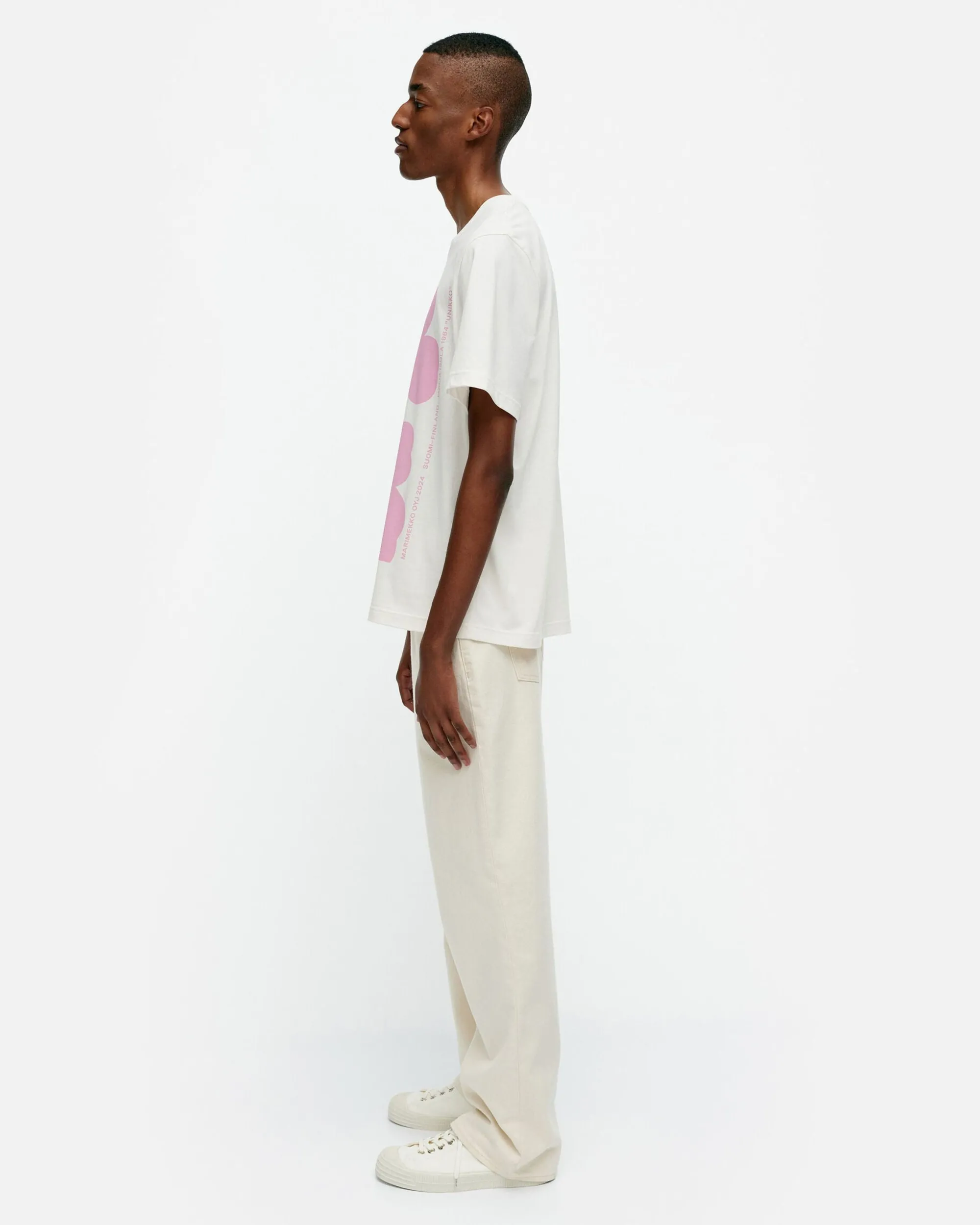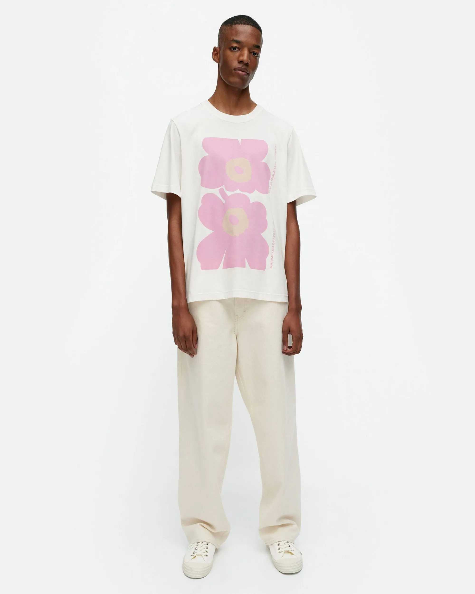 Embla-T-Paita On Valmistettu Luomupuuvillatrikoosta Ja Siinä On Miesten Mitoitus. T-Paidassa On Resori Pyöreässä Pääntiessä Ja Kappalepainettu Unikko-Kuosi Sekä Marimekon Printtiteksti Edessä.