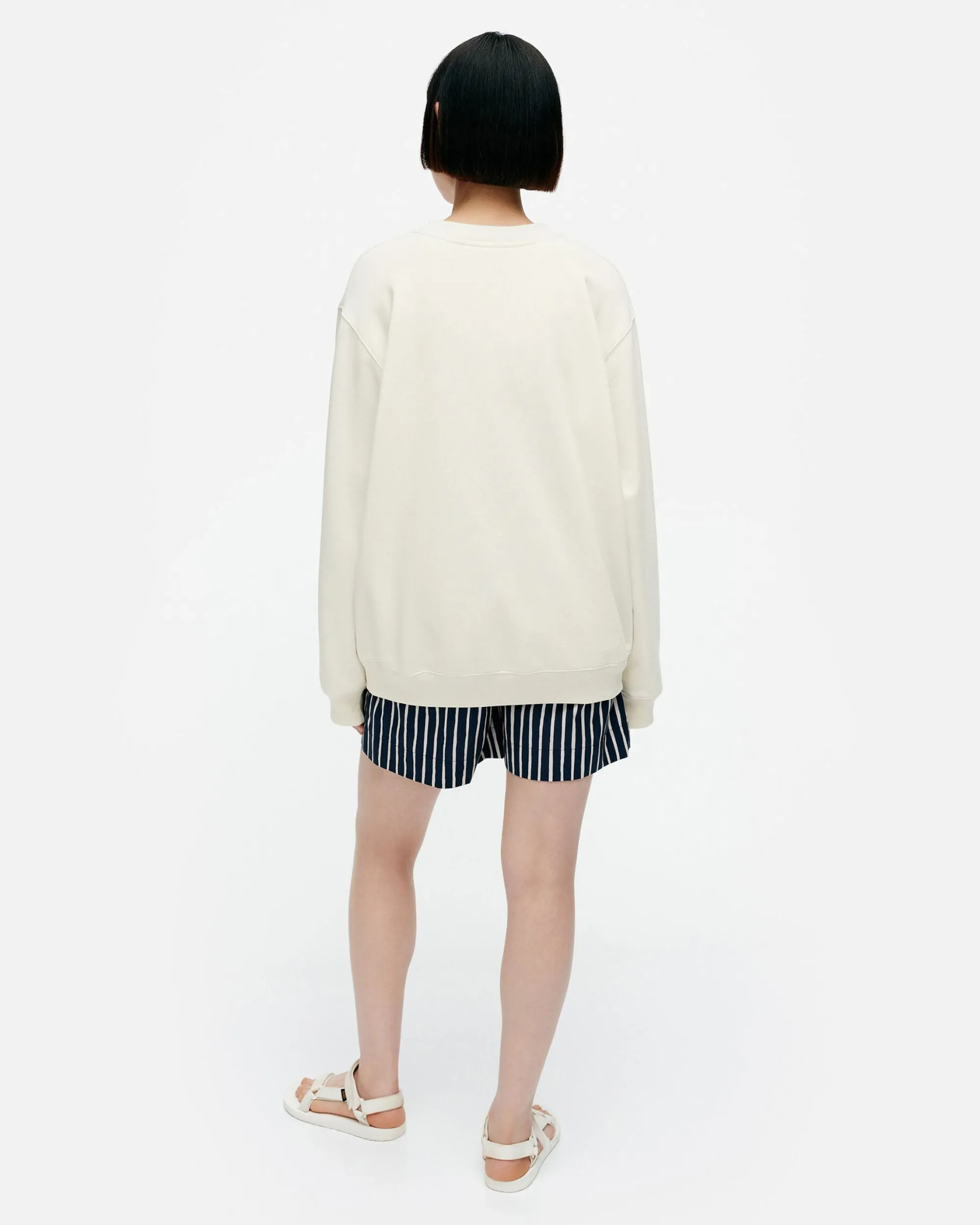 Loisto-Collegepaita On Valmistettu Luomupuuvillacollegesta Ja Siinä On Miesten Mitoitus. Etupuolella On Kappalepainettu Unikko-Kuosi Ja Marimekon Printtiteksti. Paidassa On Resorikantilla Huoliteltu Pyöreä Pääntie Ja Leveät Resorit Hihansuissa Sekä Helmassa.