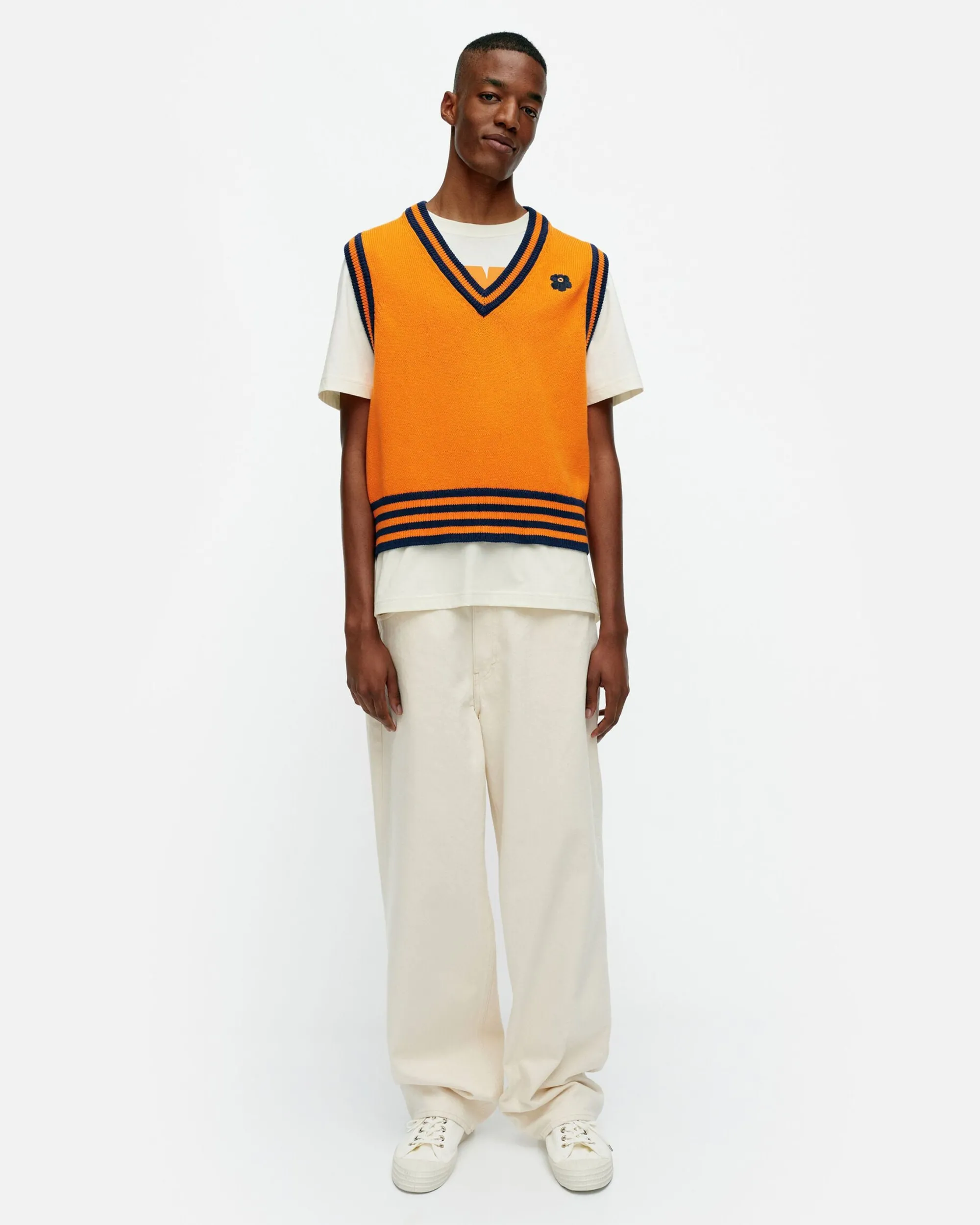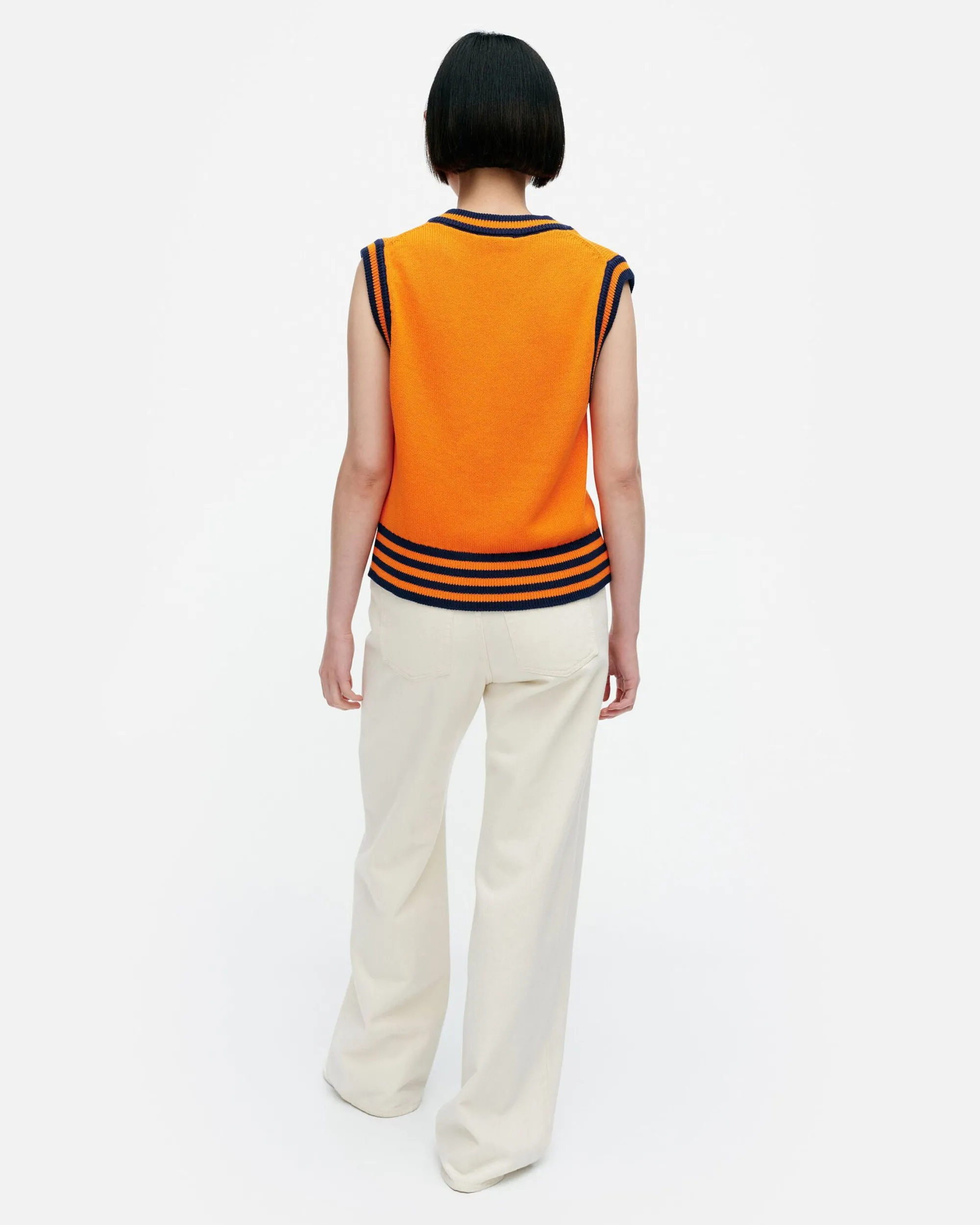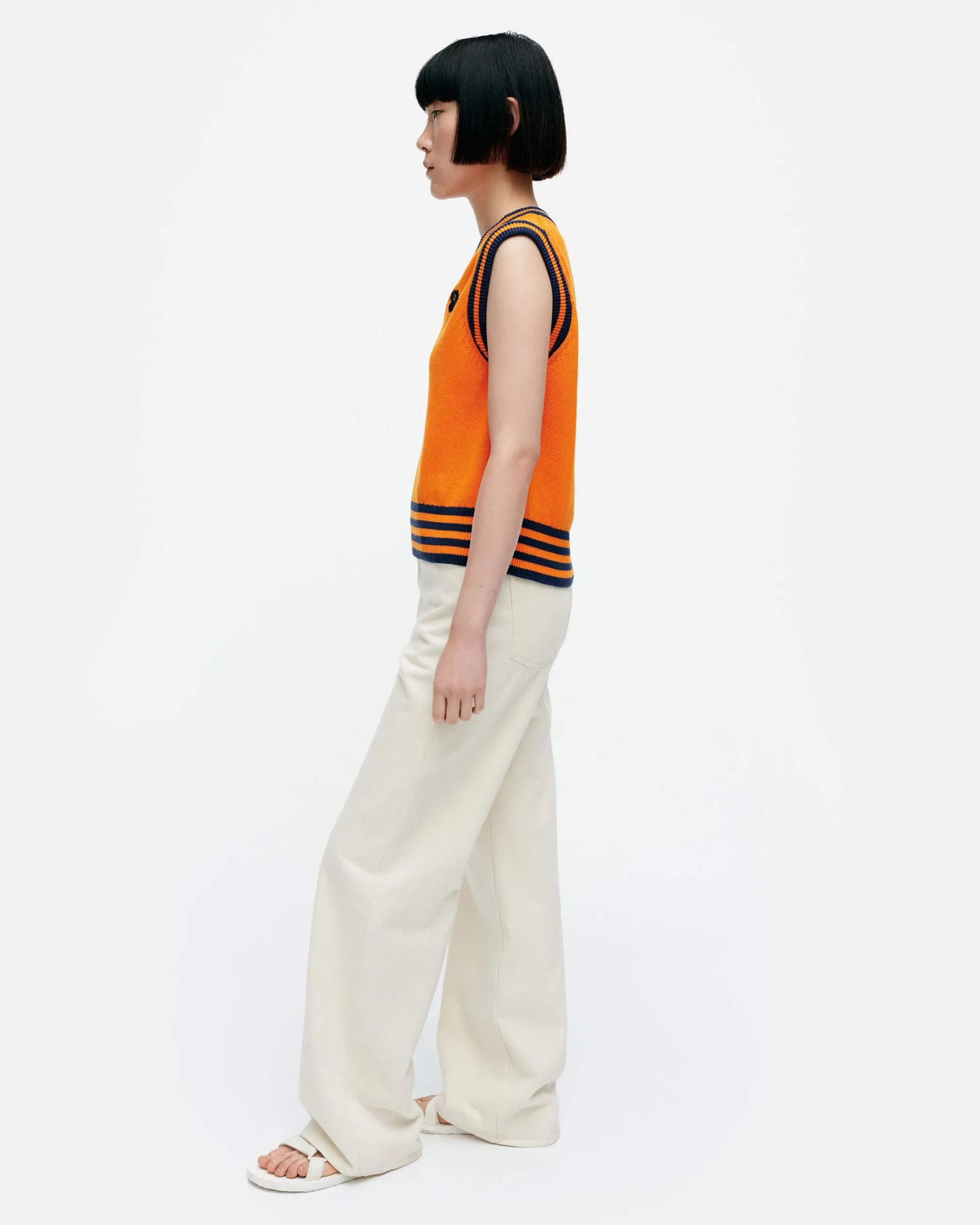 Siete-Neuleliivi On Valmistettu Luomupuuvillasta Ja Siinä On Niukka Istuvuus Sekä Suora Leikkaus. Liivin Resoreissa Patja-Kuosi Ja Etupuolelle On Brodeerattu Pieni Unikko-Kuosin Kukka. Lyhyessä Neuleliivissä On Leveä Tuplaresori V-Pääntiessä, Resorit Hiha-Aukoissa Sekä Leveä Resori Helmassa.