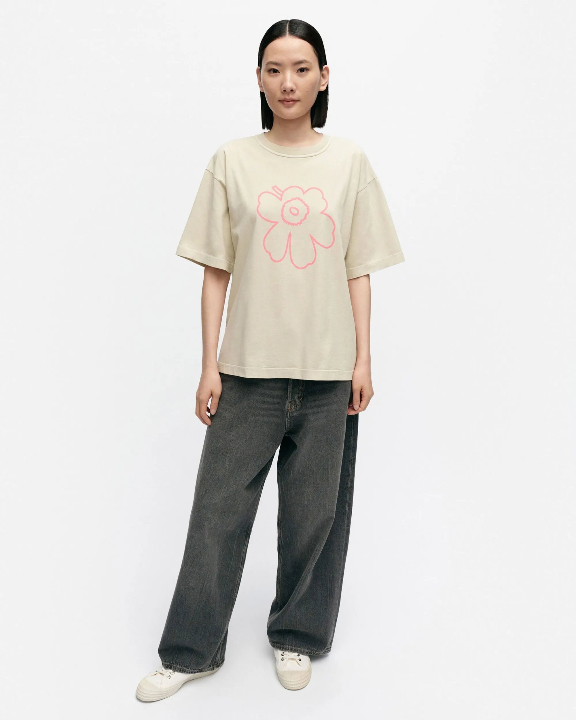 Veig-T-Paita On Valmistettu Mineraalivärjätystä Luomupuuvillatrikoosta Ja Siinä On Väljä Istuvuus. T-Paidassa On Neonvärillä Painettu Piirto Unikko -Kuosin Kukka Etupuolella Ja Leveä Resori Pyöreässä Pääntiessä.