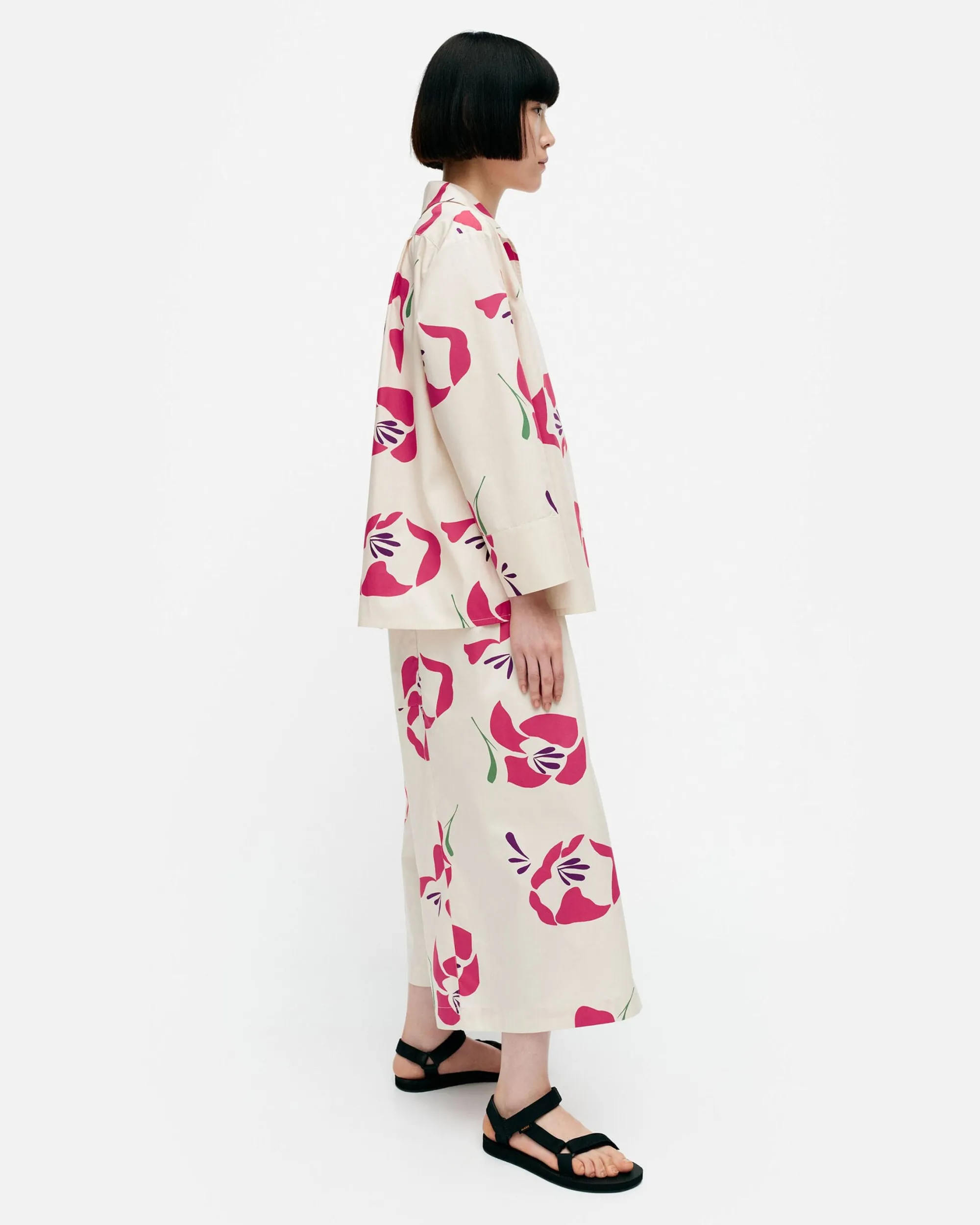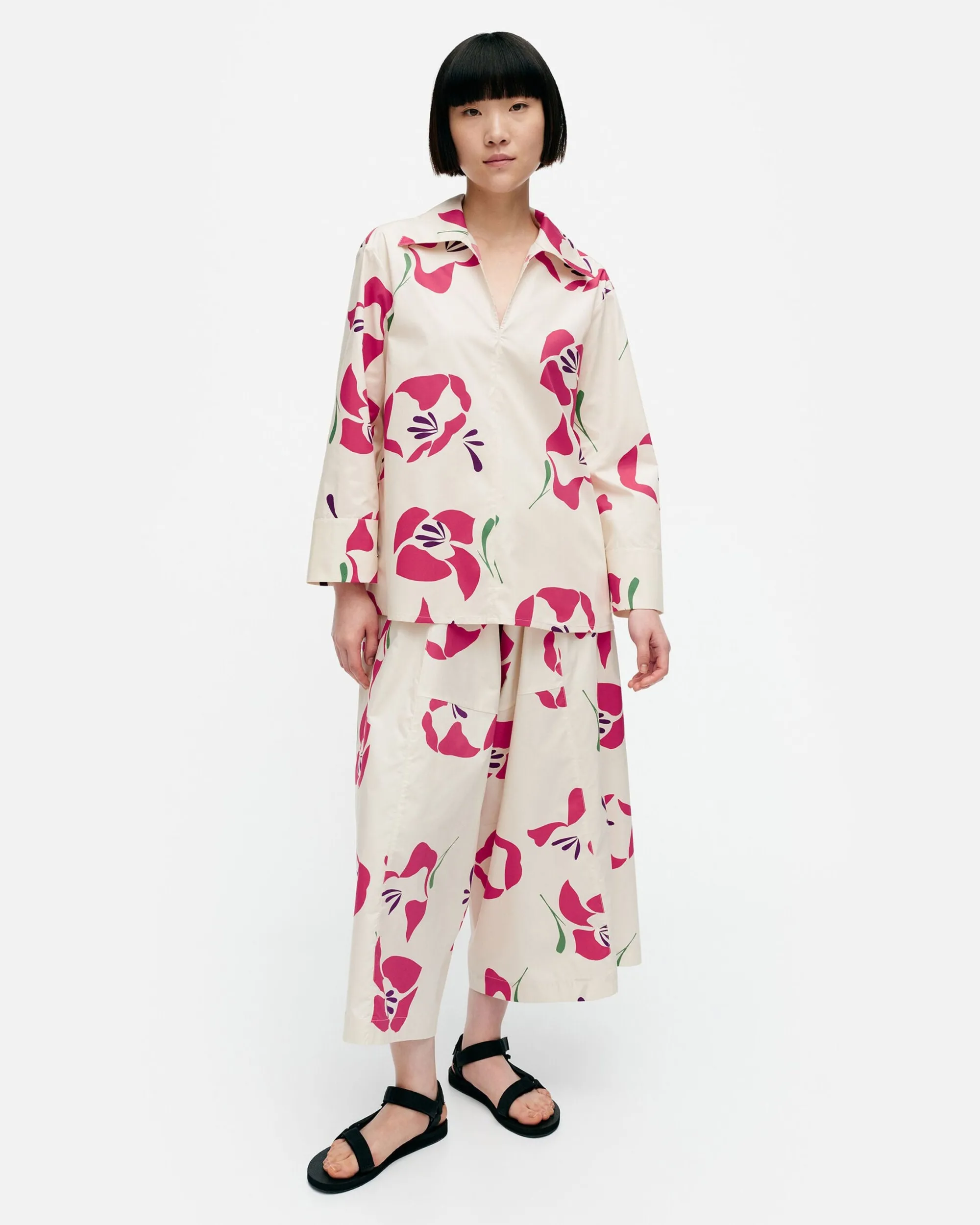 Helakka-Kuosinen Mikea-Pusero On Valmistettu Luomupuuvillapopliinista Ja Siinä On Rento Istuvuus Sekä A-Linjainen Leikkaus. Puserossa On Paitakaulus Ja V-Pääntie Sekä Keskietusauma. Selkäpuolella On Kaarrokesauma Sekä Laskokset Ja Hihansuissa On Leveät Mansetit.