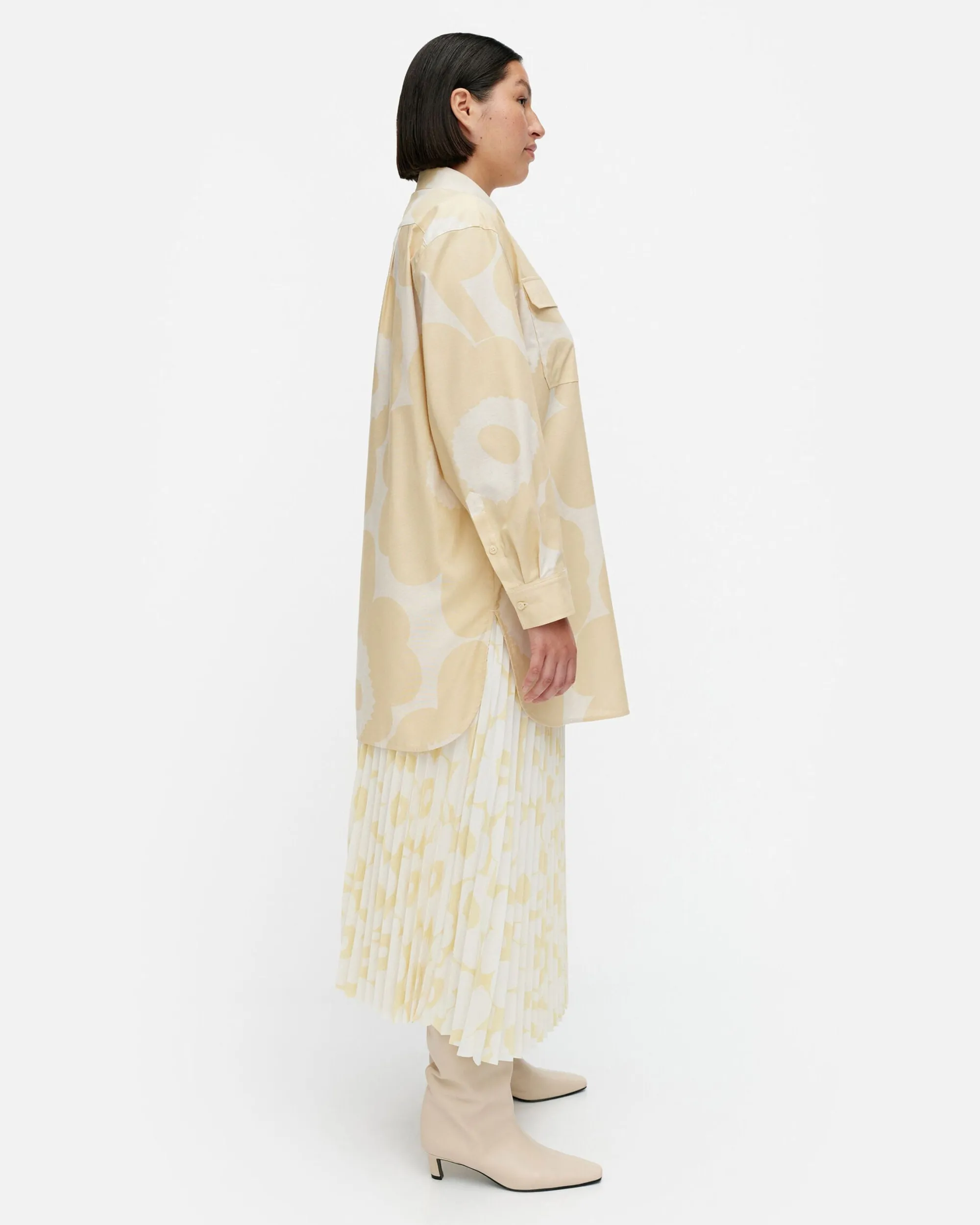 Mystiikka-Kauluspaidassa On Väljä Istuvuus, Suora Leikkaus Ja Unikko-Kuosi. Paita On Valmistettu Chambray-Luomupuuvillakankaasta, Joka Antaa Vaatteelle Eläväisen, Meleeratun Pinnan. Paidassa On Nappilista Ja Rintataskut, Joista Vain Toisessa On Läppä. Hihansuissa On Napitettavat Mansetit Ja Helmassa On Pyöristetty Leikkaus Ja Sivuhalkiot.