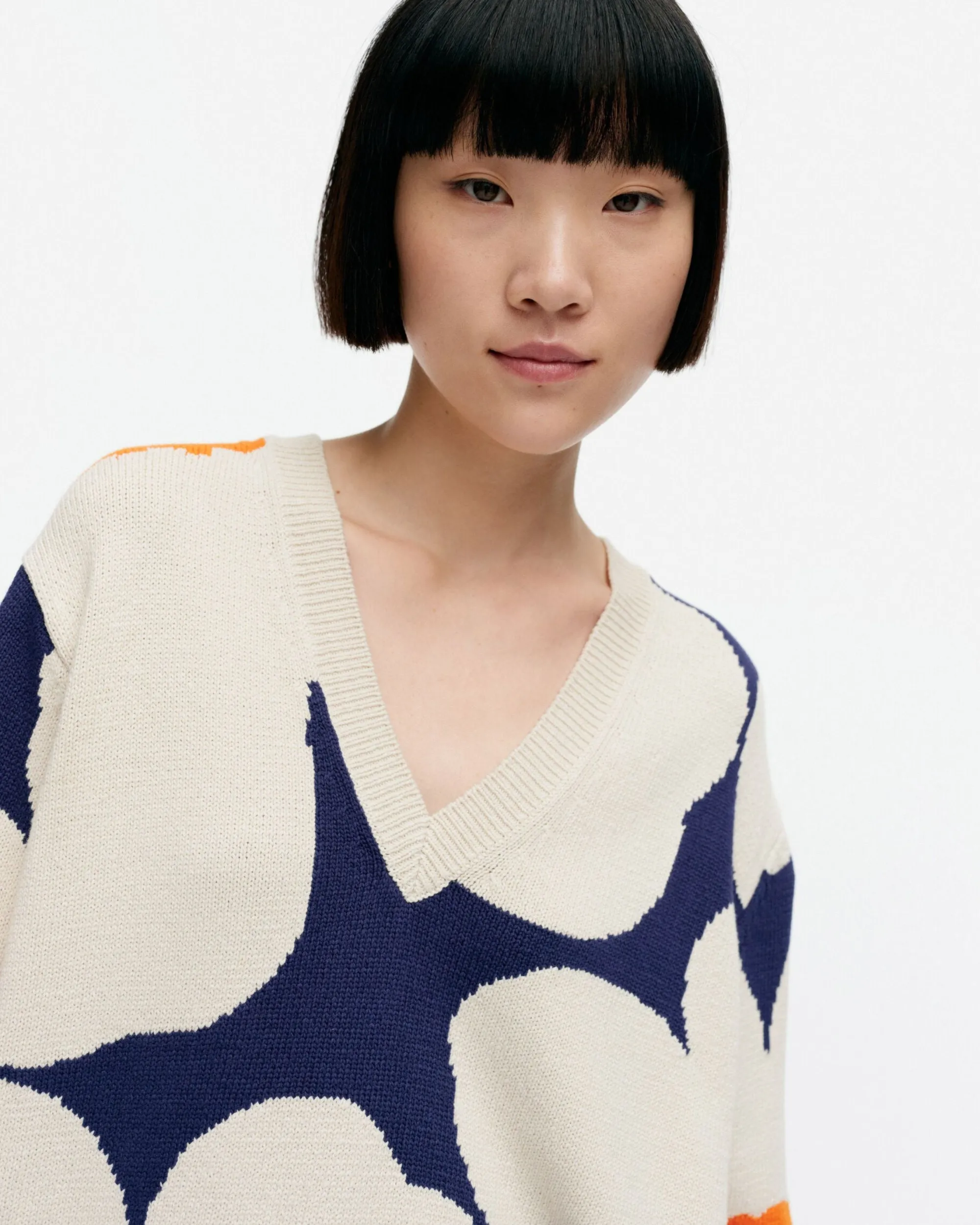 Unikko-Kuosinen Päivä-Neulepusero On Valmistettu Luomupuuvillasta Ja Siinä On Rento Istuvuus Sekä Suora Leikkaus. Neulepuserossa On Syvä V-Pääntie Resorireunuksella Ja Helmassa Sekä Hihansuissa On Leveät Resorit.
