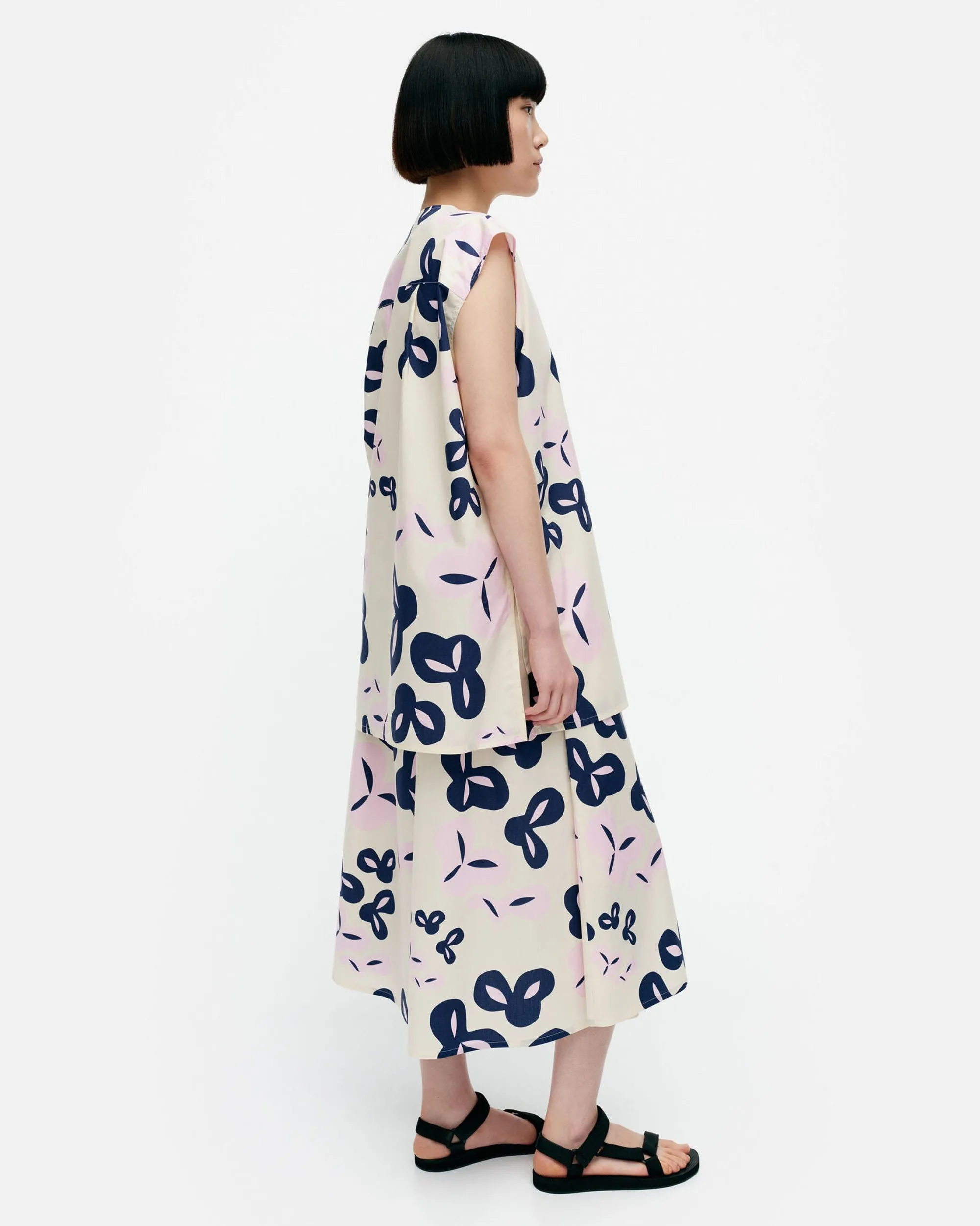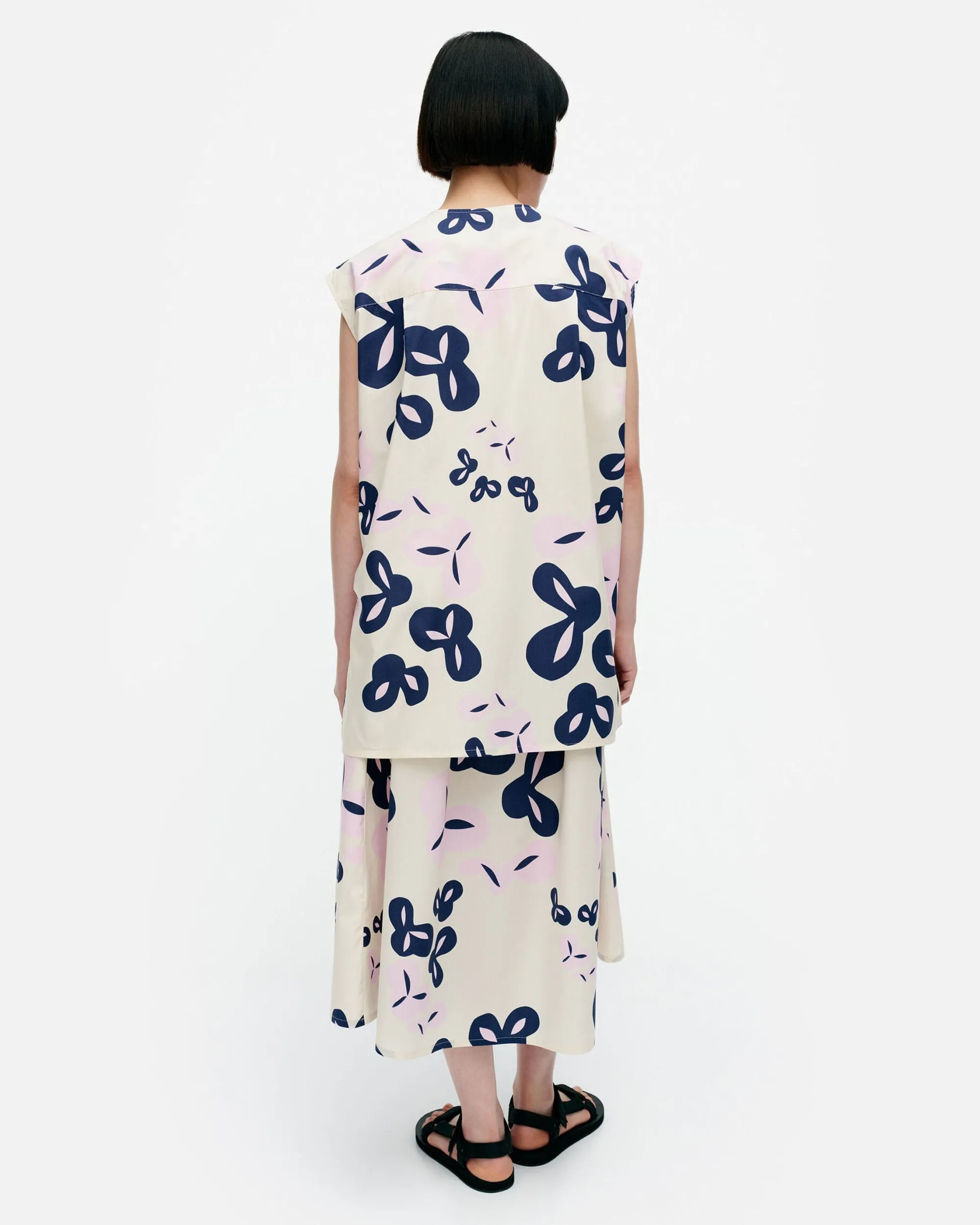 Poiminto-Kuosinen Pudas-Tunika On Valmistettu Luomupuuvillapopliinista Ja Siinä On Väljä Istuvuus Sekä Suora Leikkaus. Tunikassa On Pyöreä Pääntie, Lyhyet Holkkihihat Ja Nappisuljenta Edessä. Selkäpuolella On Kaarrokesauma Ja Laskokset Ja Helmassa On Sivuhalkiot. Kangas On Painettu Helsingissä.